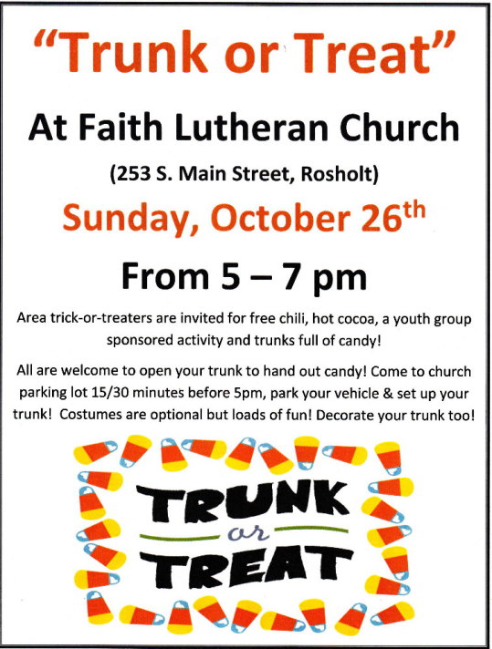 In-house and online services are held at Faith Lutheran in Rosholt at 8:45 AM and North New Hope at 10:45 AM.