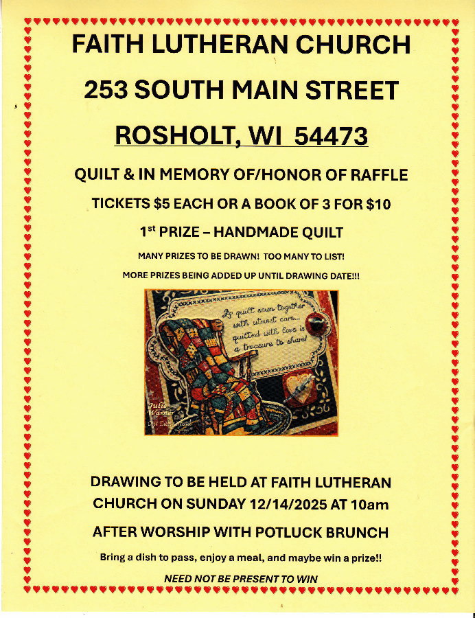 In-house and online services are held at Faith Lutheran in Rosholt at 9 AM and North New Hope at 10:30 AM.